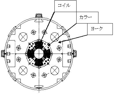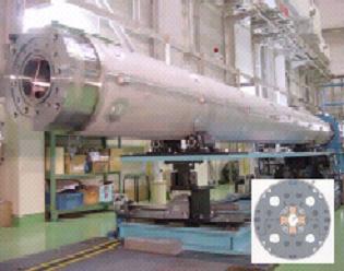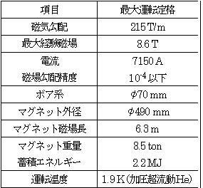 この超伝導四極電磁石は、全長7 m、内径70 mmの口径内に四極磁場を発生する。表1に詳細な電磁石諸元、図1, 2に電磁石外観と断面写真を示す。全長6.6 mの超伝導鞍形コイルが中心孔を取巻く様に配置され、非磁性構造部材を介して上下2分割の鉄ヨークを一体化し、効率良くコイルの電磁力を支える構造となっている。陽子ビームを正確に衝突させるためには高精度の四極磁場を発生することが必要で、主要部品を10 m単位の製作精度でコントロールすることにより、均一度が1万分の1という磁場勾配精度を達成している。