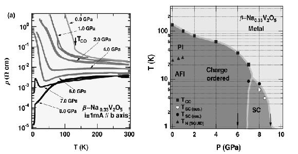 物性研、上田研究室の山内徹氏らは、2002年、バナジウム酸化物β-Na0.33V2O5およびβ’-Cu0.65V2O5が、高圧下においてそれぞれ臨界温度8 Kおよび6 Kの超伝導を示すことを発見し、Physical Review Letters誌などに報告した[1, 2]。この物質は、バナジウムのジグザグ鎖と梯子鎖が複合した結晶構造をとり、低温常圧下では、多くのバナジウム酸化物に見られるように、電荷が秩序化し、絶縁体(電子固体)となる。研究チームは、キュービックアンビル型高圧装置により8 GPaもの静水圧を加えると、電子固体が融解し、臨界温度8 Kの超伝導が発現することを発見した(図1)。さらに、2004年3月27~30日、九州大学において開催された日本物理学会第59回年次大会において、β-Ag0.33V2O5が6.5 GPaの高圧下で臨界温度6.5 Kの超伝導を示すことを報告している。