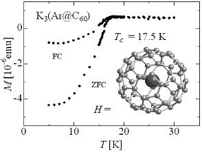図3 K3(Ar@C60)における超伝導転移を示す磁化と希ガス内包Ar@C60分子。