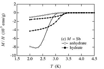 母体となる (MS)1+(TaS2)2 (M = Sn, Pb, Sb, Bi)は、岩塩構造をとる1枚のMS層と2枚のTaS2層が交互に積層した構造をとり、MS副格子とTaS2副格子のa軸長が異なることから、ミスフィット化合物と呼ばれている。片山氏らは、隣接するTaS2層間に様々な分子や金属原子が挿入可能なことに着目し、Naイオンと水分子を挿入した化合物Nax(H2O)y(MS)1+(TaS2)2 を合成した。このうち、M = Sn とした物質が臨界温度4.0 K、M = Pb, Sb がそれぞれ3.7 Kおよび3.5 Kで超伝導を示すことを発見した。水分子を含まない母物質 (MS)1+(TaS2)2 も、臨界温度3 K程度の超伝導を示した(図4)。