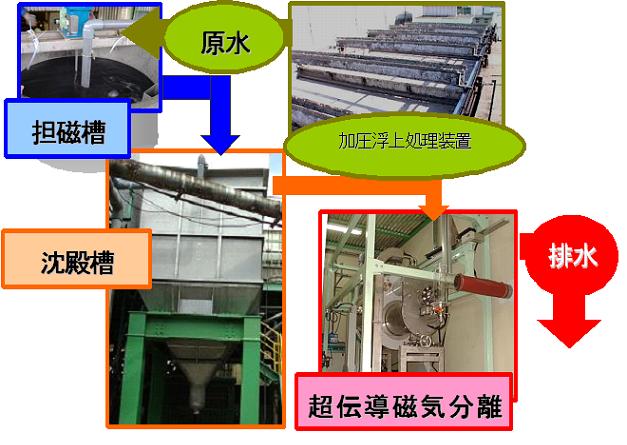 製紙工場では工程で大量の水を使用しており、それとほぼ同量の廃水を出しているが、環境保全への意識が高まるにつれて排出基準が強化される傾向にあるため、その廃水処理に対して高度の技術を導入する必要が出てきていた。特に再生紙製造工場などは再生ルートの確保のため都市近郊に立地しており、必然的に厳しい廃水の排出基準が設定されているのが現状である。そこで同共同研究体は、新しい概念に基づく水資源創造技術の一つとして超電導磁石を利用した廃水再利用システムの構築を目指していた。このシステムが完成すれば、排出基準が厳しい都市近郊であっても廃水を排出しないため将来的に基準が強化されても新たな対応策を考える必要がなく、しかも経済性や設置面積の問題も心配しないで良いため、廃水処理システムとして将来、製紙廃水だけに留まらず、食品工場など様々な都市近郊立地型工場に取り入れられる可能性が高い。 現在、大阪近郊の工場に実際に設置されている廃水処理のシステムフローを図1に示す。