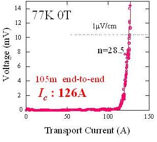 フジクラは昨年100 m全長において38 AのIc値を達成しているが、今回は、CeO2キャップ層を用いた中間層の高配向化によりY123の面内配向性が = 3° 程度に向上したことに加え、全長にわたる膜の均一性を向上するノウハウを蓄積した結果特性を飛躍的に向上させることに成功した。図1に示すように、均一性を図る尺度であるI-V曲線のn値については、昨年の約17に対して今回は28を超えている。このように均一性が向上したことについて、フジクラ材料技術研究所主管部員の飯島康裕、 柿本一臣両氏は、reel-to-reel方式で連続形成する際に、限られた条件範囲内に収めた形で長時間安定合成するためのノウハウが向上してきたことを挙げている。高特性Y123膜を得るためにはa軸配向粒や界面生成物の発生を抑制するとともにas grownにおいて過度の酸素欠搊を防ぐ必要があり、膜が厚くなるに従いこれらをすべて両立する条件が狭く、また線長が長くなるに従い厳しい条件の安定性が求められる。さらに金属基板や中間層の表面状態の管理も長くなるに従い厳しくなる。図2に示すように、これらの蓄積により3年前に10m長の均一成膜の技術に到達し今回100m長において高特性を得る技術に到達した。IBAD法中間層については図3に示すように255 m長にわたって均一な2軸配向Gd2Zr2O7膜の成膜に成功している。これまで同社で達成したY123線材のIc x L の値は3年ごとにほぼ一桁向上してきているが、今後は現在の技術の延長で年度内に200 m長においてIc > 200Aを達成する目標で開発を進めているほか、2007年度までに500 mにする目標で新たなプレパイロットプラントを導入している。新規導入設備においては主に大面積成膜によって現在1~2 m/hのところを5~10 m/hの生産速度を確保するとともに、500 m長にわたってより安定した高品質膜の形成を行うための生産技術を開発する。