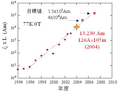 図2 フジクラにおいてこれまでに開発した線材のIc x L 値と目標値