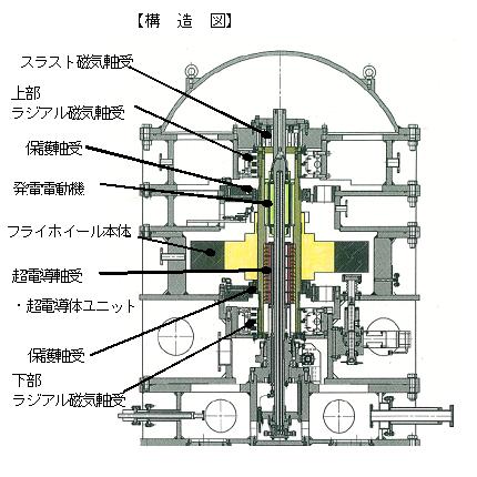 直径1.0 mのCFRP製フライホイールや回転軸などの回転部の総重量は433 kgあり、これを軸中央部のラジアル型超電導軸受のみで支持する。軸の上下にはラジアル磁気軸受があって、ラジアル方向の回転振動を抑制する。これら2種の軸受により完全非接触高速回転を実現する。ラジアル型超電導軸受の軸方向長さは約30 cm、超電導体と永久磁石の対向面積は1,160 cm2であり、回転体を支持した時の超電導軸受の載荷力密度は0.37 kg/cm2となる。他に軸受としては、調整時に一時的に使用するだけのスラスト磁気軸受と超電導軸受のクエンチ時などに回転体を支える保護軸受があるが、これらは何れも通常の運転時には使用せず、非接触である。エネルギーの出し入れは発電電動機により行う。