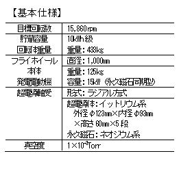 本機の最大の特徴は、将来のシステムの大型化を見越して基本的な構造をラジアル型超電導軸受を用いたアウターローター型にしていることであり、普通のインナーローター型に比べて容量の割には複雑になっている(図1)。YBCOバルク超電導体の冷却とネオジム永久磁石の耐遠心力対策のために、超電導体を内側の固定軸側に、そして永久磁石を外側の回転軸側に配置し、その回転軸にフライホイール本体を締結している。回転軸内部にアウターローター型発電電動機を収紊し、回転軸の外側にラジアル磁気軸受を配する2重構造とすることにより、軸長を短くして回転の安定化を図っている。