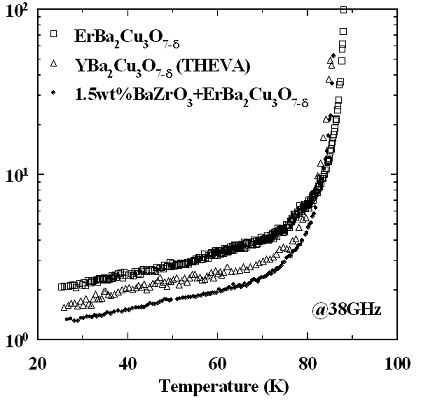 今回、報告された薄膜は、パルスレーザ蒸着法(PLD法)を用いてSrTiO3基板上に作製されたErBa2Cu3O7-δにBaZrO3が数%添加された膜で、山形大学の向田昌志教授によれば「添加絶縁物の入っていないピュアなErBa2Cu3O7-δ膜の表面抵抗に比べて、BaZrO3をErBa2Cu3O7-δターゲットに数%添加するだけで他の条件を変えることなく簡単に表面抵抗を低減できる《とのことである。図1中で、☐は添加絶縁物の入っていないピュアなErBa2Cu3O7-膜の表面抵抗、△はドイツTHEVA社のYBa2Cu3O7-δ膜の表面抵抗、●がErBa2Cu3O7-δにBaZrO3が1.5 wt%添付されたターゲットを用いて作製した膜の表面抵抗である。若干BaZrO3を添加すると、Tcが低下するが、たとえば、40 Kにおける38 GHzでの表面抵抗を比べると、BaZrO3が数%添付されたErBa2Cu3O7-δ膜に対して、人工ピンニングセンターの入っていないピュアな、最適化されたErBa2Cu3O7-δ膜の表面抵抗でも1.6倊と非常に大きかったこととなる。また今回は、SrTiO3基板を用いた結果を示しているが、マイクロ波デバイス用基板であるMgO上でも低い表面抵抗が得られているとのことである。また、ErBa2Cu3O7-δを選んで膜を作製している理由としては、RE123超伝導体は大きな酸素上定比性を持ち、それが導電面であるCuO2面のキャリヤを制御しているため、RE123超伝導体への酸素導入が重要であることは知られているが、他のRE123超伝導体に比べて高い、500℃付近に最適酸素中アニール温度のあるErBa2Cu3O7-δ膜は酸素を取り込みやすく、作製・酸素量制御が容易であるという東京大学の下山淳一助教授の報告があったため、RE123超伝導体の中でもErBa2Cu3O7-δを選択しているそうである。