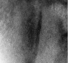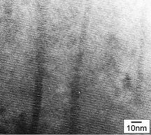 静岡大学の喜多隆介教授によれば、山形大学には第一段階として0.5~1.5%BaZrO3微粉末添加ErBa2Cu3O7-δターゲットを、第二段階として2~3%添加のターゲットを送ってあるので、人工ピンニングセンター導入量依存性が今後詳しく調べられるであろうとのことである。また、BaZrO3以外にも、人工ピンニングセンターとして有望な材料をいくつか検討中とのことである。電力中央研究所の一瀬中主任研究員によれば、山形大学のBaZrO3が数%添付されたErBa2Cu3O7-δ膜の断面TEM像を観察したところ、BaZrO3が添加されていない膜に比べて、膜内部に無数の筋状の欠陥が観察されたとのことである (図2) 。これがBaZrO3そのものなのか、BaZrO3によって誘起された結晶欠陥なのかを詳細に調べているところである。特に注目すべきは、この欠陥がErBa2Cu3O7-δ膜のCuO2面に垂直に(ErBa2Cu3O7-のc軸に沿って)成長している点で、c軸方向に磁場が加わったときに有効なピンとなるとコメントしている。また、この欠陥以外は、ピュアなErBa2Cu3O7-δ膜同様、高い結晶性を示しているとのことであった。