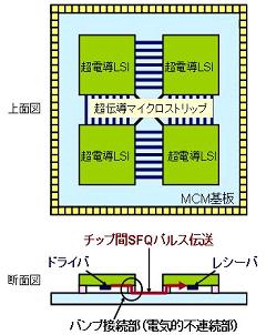 SFQを情報担体として処理するSFQディジタル回路は、半導体回路に比べて1/1000程度の消費電力で、100 GHz以上の高速クロックで動作するポテンシャルを持つ。すでにマイクロプロセッサ、スイッチ、ADコンバータなどが10~40 GHz程度の高速クロックで実証されている。SFQ回路の超高速動作の優位性をシステムレベルで活かすには、チップ間高速信号伝送が可能なMCMが上可欠である。MCMは超電導ディジタルチップを超電導基板にフリップチップボンディングして作製される(図1)。チップ間でのSFQパルスの送受信はドライバ回路とレシーバ回路が行う。チップ間SFQパルス伝送の技術的困難は、チップと基板を機械的・電気的に接続するはんだバンプでの電気的上連続に起因するパルスの反射と透過搊失である。SFQパルスは幅数ピコ秒の非常に短いパルスなので、バンプにはDC ~ 数100 GHzにわたる広い帯域が要求される。これまで、ジョセフソン接合を集積した能動基板を用いることによりバンプの帯域の問題を回避する方法や、2磁束量子(DFQ)ドライバを用いて伝送エネルギーを増加し、かつ反射を速やかに減衰させる方法などが提案されていたが、いずれの方法もハードウェアが複雑になり、ドライバとレシーバそれぞれに2~5個ずつのジョセフソン接合が必要であった。それだけではなく、DFQドライバを用いた方法はスループットが低いためチップの高速性をMCMで活かしきれないという問題があった。超電導工学研究所は、たった1個のジョセフソン接合で構成されるドライバとレシーバで、SFQパルスの高速チップ間伝送ができることを今回実証した。この方法は最も回路構成が単純で、かつ最もスループットが高い。