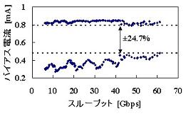 チップと基板はNECのNb標準プロセスで試作された。接合の臨界電流密度は2.5 kA/cm2である。フリップチップボンディング後のバンプ高さは約3.5μmであった。図2に、測定したドライバ・レシーバの共通バイアスマージンのスループット依存性を示す。ドライバとレシーバを接続するマイクロストリップラインの長さ(6.4 mm)に起因する共振周波数(約9 GHz)とそのハーモニクスを除く周波数でのマージン劣化はほとんどないことから、バンプでの反射の影響がみごとに低減されていることが分かる。60 Gbpsまでのバイアスマージンは約±25 %であり、実用上十分である。60 Gbps伝送時のドライバとレシーバの消費電力は約60 nWであり、ビットエラーレート(BER)は10-12以下と非常に安定であった。測定された最大スループットとBERは測定方法で制限されているため、この回路構成でさらに高いスループットが可能である。