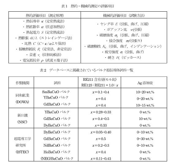 バルク超伝導体の工学的応用や基礎物性解明において、熱伝導率や熱膨張などの熱的特性や、ヤング率や破壊強度などの機械的特性は重要なパラメータである。岩手大学の研究グループでは、これまでに低温(4~300K)、強磁場(0~10T)におけるこれらの物性評価技術の確立と測定装置の開発を行ってきた。この装置を用いて、これまでに同和鉱業、新日鐵、超電導工学研究所で作製されたY系、Sm系、Gd系、Dy系、Nd系、Ho系の50種類以上のバルク超伝導体のab面内とc軸方向の測定を行い、学会や論文誌に数多く発表してきた。岩手県地域結集型共同研究事業(平成11~16年度:研究総括 能登宏七岩手大学吊誉教授)の一環として進められたこれらの研究成果をデータベースとしてまとめ、昨年9月よりインターネット上での公開をスタートした。すでに5月末現在、熱的特性には約790件、機械的特性には約1150件のアクセスがある。このようなバルク超伝導体に関する系統的なデータベースは国際的にも存在せず、研究者や技術者にとっては重要なデータである。表1に測定項目の一覧を、表2に掲載されているバルク超伝導体試料の一覧を示す。