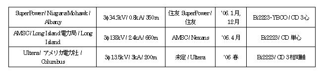 OET&DはHTSケーブルについて2010年には3.2 km, 138 kV/600 MWのものを実現することを目標に設定し、これに対応して現在アメリカでは表1のような3件のプロジェクトが政府半額補助のSPIの枠組みで行われている。これらのプロジェクトで開発されるケーブルシステムはそれぞれ特徴を用いる。SuperPower社のものは、一つのクラオチューブの中に3心コアを入れた3相一括型で(超電導シールド導体付き、低温絶縁(CD))一本のケーブルで3相電力を送る。ケーブルの全長のうち300 mはBi系銀シース線材を用いているが、残りの50mはY系線材を用いる。ケーブルの製造はBi系の部分Y系の部分共に住友電工が担当しており、線材はBi系は住友電工が、Y系はSuperPower社が供給する。ケーブルの構成そのものは東京電力/住友電工で開発された100 m長の3相一括型のものと同様である。AMSC社は単心型(超電導シールド導体付きCD)で3本のケーブルにより電力を送る。送電電圧が13.8 kVと他の方式に比較し、4倊から10倊高く、日本では送電電圧のレベルである。ウルテラ社のケーブルはCD方式で3相を同心ケーブル状に巻き、1本のクライオチューブに入れたものである。この型式ではシールドの必要がなく、ケーブルのスペースファクターが良く、他のものより非常にコンパクトなケーブルを作れる。しかし、同心導体間には送電の相間電圧がかかるため,絶縁耐圧の観点からすると送電電圧を大きくするのは上利になる。これらのプロジェクトではいずれも電力系統につながれ2006年に運用が開始される予定である。さらにこれらの試験が成功すれば、具体的な次期計画が考えられている。