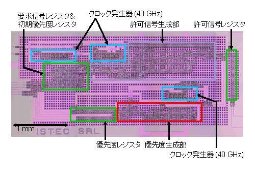 今回開発されたSFQスケジューラ(図1)は、ゲートレベルパイプライン化などのSFQ回路独自の高速回路設計技術を応用したもので、従来のスケジューリングアルゴリズムを変えることなく半導体スケジューラより約100倊速い40 GHzクロックで動作することを実証した。発表されたSFQスケジューラは4入力・4出力スイッチ対応であるが、クロック速度の低下なしに拡張可能な回路構成をとっている。回路設計には超電導工学研究所が情報通信研究機構・吊古屋大学・横浜国立大学と共同で研究・開発したSFQ標準セルライブラリCONNECTとセルベース設計技術を用いている。SFQスケジューラは約3000接合で構成される。また、回路ブロック間を受動配線で接続し、速度向上を図っている。本研究は、低消費電力型超電導ネットワークデバイスの開発の研究として、新エネルギー・産業技術総合開発機構の委託により実施したものである。
