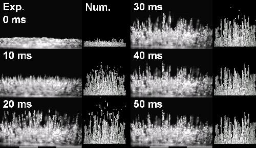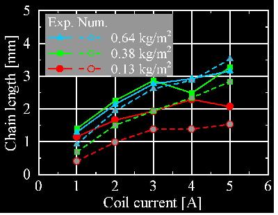 図1は磁性粒子チェーンの形成過程における二次元シミュレーションの結果として紹介されたものである。シミュレーションには運動方程式を粒子個々について解く個別要素法が用いられており、この結果は実験で実際に見られる磁性粒子チェーンの形成過程とよく一致しているという。また、シミュレーションではチェーンの形成過程が進むにつれて、系のポテンシャルエネルギーが小さくなるという結果も紹介された。このことから、系の 全ポテンシャルエネルギーが最小になるようにチェーンは形成されているということである。更に、チェーンの長さには各コイル電流値に対して最安定長さが存在し、その長さは粒子数と磁場が大きくなるほど長くなるという計算結果(図2)も紹介された。チェーンの形状に関して実験と数値計算の結果を比較してみると、実験では数値計算の結果よりもチェーンは長くなり、傾斜角は大きい結果になるという。中山氏によると、これらの結果の違いは、数値計算において粒子の回転により生じる粒子間での摩擦を無視したことが原因であるということである。また、中山氏は現在、三次元でのシミュレーションの研究もしており、その途中段階の結果も紹介して頂いた。次元を拡張することにより、より精度の高い計算結果が期待できるということである。また、レーザープリンターで用いられているマグネットローラの磁場の大きさは通常0.1 T程度であるが、実験により更に強い磁場とチェーンの長さの関係を調べた結果(図3)を講演の最後に紹介して頂いた。チェーンの長さは0.1 T程度で最大値となり、それ以降は磁場が大きくなるにつれて短くなるという。