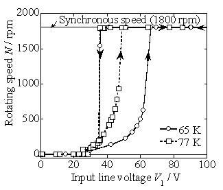 同図中77.3 Kの結果を見ると、試作したモータは入力電圧がある閾値(28.3 V)に達したところで始動し、49.0 Vで見事に同期回転数(1800 rpm)に引き入れられている。上記閾値電圧は、かご型巻線ループの超電導状態を破って磁束フロー状態に移行させる電圧値に対応しており、理論予測とほぼ一致することを確認している。一方、入力電圧を下げた場合には、35.8 Vに到達するまで同期回転数を維持し、その後同期外れを起こしてすべりモードに移行している。つまり、無負荷特性は履歴を示しており、同期回転中の超電導かご型巻線ループに磁束が捕捉されている証拠と考えられる。さらに、運転温度を65 Kへ下げることによって磁束ピン止め特性が向上し、同期引き入れ電圧が66. 2 Vに上昇していることも明らかになった。このことは、かご型巻線に使用している超電導線材の特性がモータの機器特性と直接結びついた知見であり、大変興味深い。同グループは、現在実負荷試験に向けた検討を行っているところである。