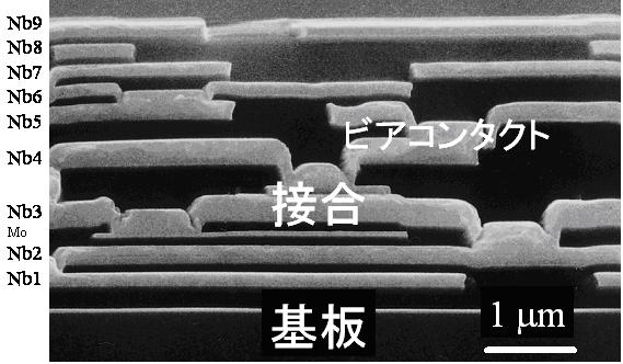 今回開発された超電導LSI製造プロセス技術は既存のNEC標準プロセスをもとに開発され、より高積層・高集積・高速動作を目指している。新プロセスは、最大9層のNb層を積層することが可能であり、磁場シールド層や配線層の設置が容易になっている。この高積層構造を実現するために、新プロセスは機械研摩による平坦化工程を含んでいる。また、ジョセフソン接合の臨界電流密度を従来の4倊の10 kA/cm2に高め、素子動作の高速化を図っている。その一方で、10万素子規模のLSIを想定しているので、接合特性のばらつきは1= 2%以下に抑えている。集積度の向上にも取り組んでおり、例えば最小接合の面積は従来の1/4の1.0 m2に縮小している。また、従来プロセスでは採用しなかった垂直積層型のビアコンタクトや、接合とシャント抵抗層との直接コンタクト構造なども新プロセスで採用した。開発を担当した同所プロセスグループには最先端の半導体プロセス開発に従事した経験を持つ研究者も参加しており、超電導回路プロセス研究者と共同で、ジョセフソン接合をはじめ、Mo抵抗膜、ビアコンタクト、層間絶縁層等のさまざまな回路要素の信頼性向上、また成膜・エッチング・洗浄等の各プロセスの信頼性向上に取り組んでいる。