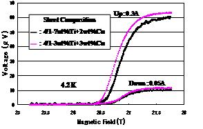ブロンズ法や内部拡散法Nb3Sn線材は、ITERをはじめとする核融合分野やNMR分析装置等に大量に用いられつつあり、製造ラインや品質管理技術の整備によってNb-Tiに続くポピュラーな線材となろう。東海大学では、次世代のNb3Sn線材としてSn-Ta系合金シートとNbシートを積層した加工の容易なジエリーロール(JR)法線材で4.2 K, 22 Tで実用可能な性能をえている。図1には、その4.2 Kにおける不可逆磁界、Birr遷移の例を示した。シート組成は、Sn/Ta原子比4/1に少量のTiを置換し、また熱処理温度の低下のため微量のCuを添加している。Ti量を増すとCu量を減らすことが出来る。図のようにonset 27.3 T, mid. 26.9 T, offset 26.5 Tと、Nb3Sn線材としては最高のBirr (4.2 K)を示す。