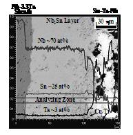 EPMAを用いた研究により、本線材では30-35原子%のNbがSn-Ta層に拡散し、その代わりにSnがNbに拡散してNb3Sn層が生成する新しい機構が見出された。図3にその反応過程を示すが、NbとSnの相互拡散によって拡散が促進され、化学量論比組成の厚いNb3Sn層が生成される。これまでのブロンズ法線材ではNbがブロンズに拡散することはなく、SnがブロンズからNbに拡散する一方向の反応のため、前述のような濃度勾配が生ずると考えられる。その結果、本線材はブロンズ法線材より明瞭に高くてシャープなTc遷移を示す。