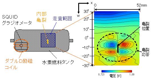 mm/sの速度で三次元的に移動させても不安定動作しないという。本装置を用いて、次世代自動車である燃料自動車に搭載される水素燃料タンクの内部欠陥検出試験を行い、その有効性を実証した。水素燃料タンクは、高密度水素燃料の貯蔵のため、肉厚のドームシリンダー形状のアルミライナー(内張り)を先進材料CFRP(カーボン繊維強化複合材料)で外側から補強した積層構造になっている。この肉厚・積層構造のため、アルミ内部に亀裂欠陥が発生した場合、渦電流や超音波、X線を用いた従来の非破壊検査技術の適用は困難であった。そこで、田中グループでは、SQUIDの低周波数帯域における高感度特性と、金属内部まで侵入できる低周波数励磁を組み合わせて、上記非破壊検査装置を用いたタンク内亀裂欠陥検出を試みた。この試験では、SQUID直下に設置したダブルD型励磁コイルから振幅約20